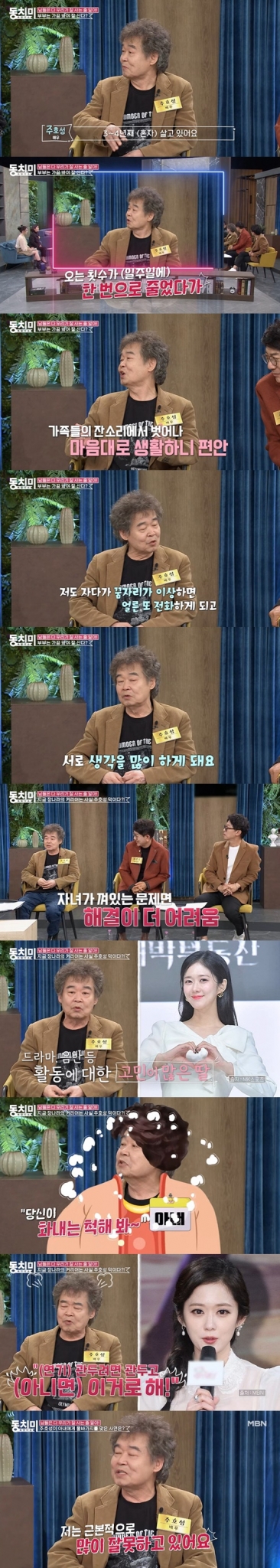 다만 주호성은 "근데 나이를 먹으니 걱정이 좀 된다. 올해 들어 주변에 고독사한 친구들이 많았다. 그러니까 그런 소식이 나오면 오밤중에 갑자기 (아내한테) 전화가 온다. 저도 자다가 꿈자리가 이상하면 얼른 전화를 하게 되고. 서로 많이는 생각하게 되더라. 애틋해진 건 있는데 편한 건 편하다"라고 말했다.