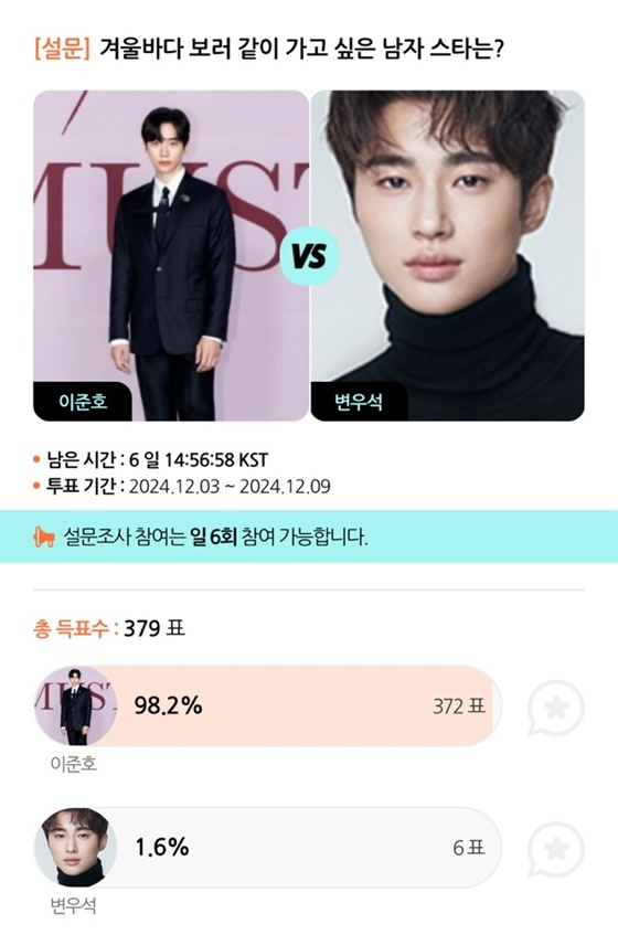 모바일 아티스트 종합 콘텐츠 앱 스타폴(STARPOLL)은 12월 3일부터 8일까지 '겨울바다 보러 같이 가고 싶은 남자 스타는?'이라는 주제로 설문 조사를 진행한다.