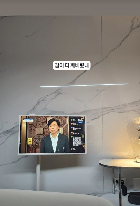 최동석은 4일 자신의 계정에 "잠이 다 깨버렸네"라며 뉴스를 시청하는 모습을 전했다. 뉴스에선 윤 대통령이 지난 3일 오후 10시 23분 대국민 담화에서 비상계엄을 선포한 내용이 담겨 있었다.