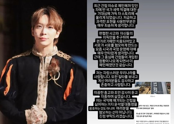 이어 "편협한 사고와 자신들의 이득만을 추구하며 편 가르기에만 치중되어 있고 서로가 서로를 혐오하게 만드는 요즘 시국과 국정 운영에 대해 매우 안타깝게 생각한다. 근데 그 중심에 간첩들이 개입된 정황이 나오게 되면서 더 예민해졌던 것 같다"라는 해명을 내놨다.