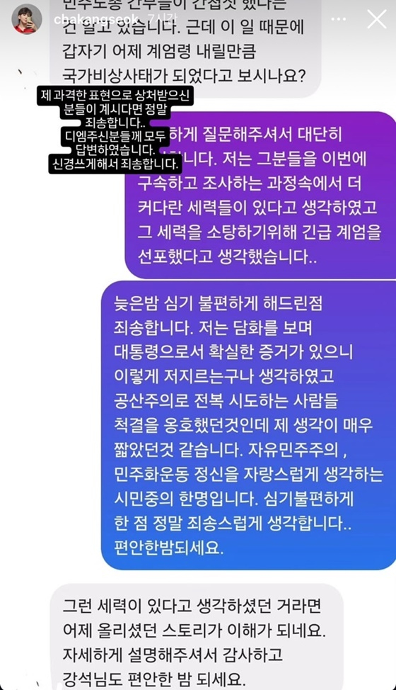 앞서 4일 차강석은 자신의 인스타그램에 "간첩들이 너무 많아. 계엄 환영합니다. 간첩들 다 잡아서 사형해 주세요"라는 글을 썼다가 뭇매를 맞았다.