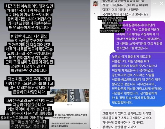 그는 "편협한 사고와 자신들의 이득만을 추구하며 편가르기에만 치중돼 있고 서로가 서로를 혐오하게 만드는 요즘 시국과 국정 운영에 대해 매우 안타깝게 생각한다. 근데 그 중심에 간첩들이 개입된 정황이 나오게 되면서 더 예민해졌던 것 같다"고 설명했다.