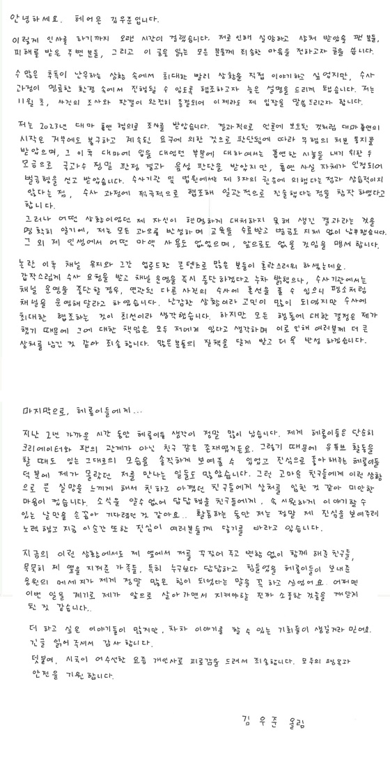 이렇게 인사를 하기까지 오랜 시간이 걸렸습니다. 저로 인해 실망하고 상처 받았을 팬분들, 피해를 받은 주변분들, 그리고 이 글을 읽는 모든 분들께 죄송한 마음을 전하고자 글을 씁니다.