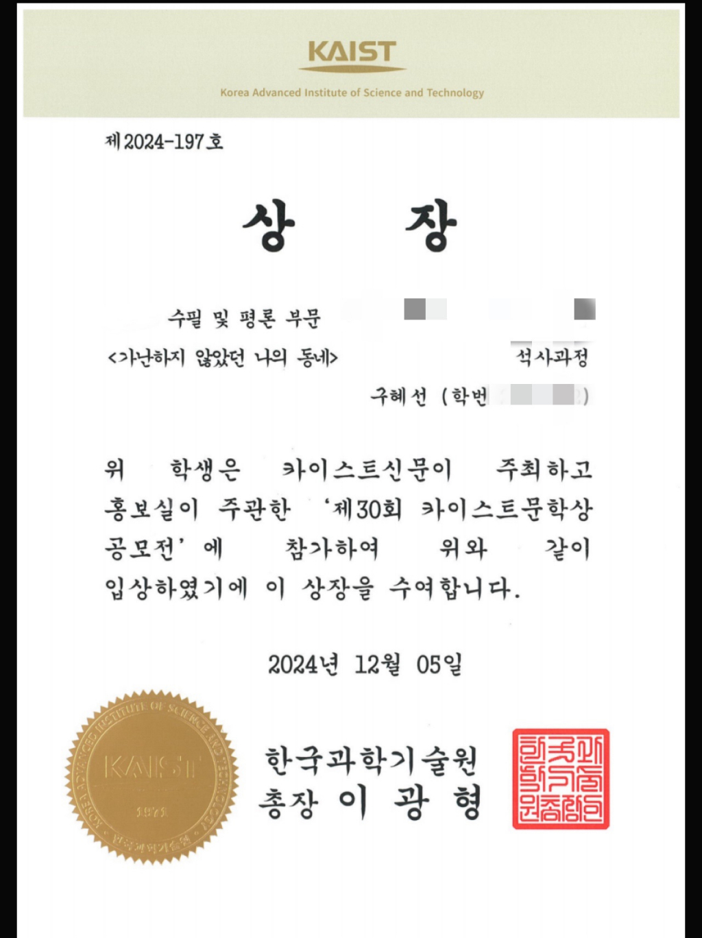 9일 소속사 엔에스이엔엠에 따르면 구혜선은 지난 4일 카이스트신문이 주관하는 제30회 카이스트 문학상에서 시, 수필, 시나리오, 소설 4개 부문 중 수필부문 수상자로 선정됐다.