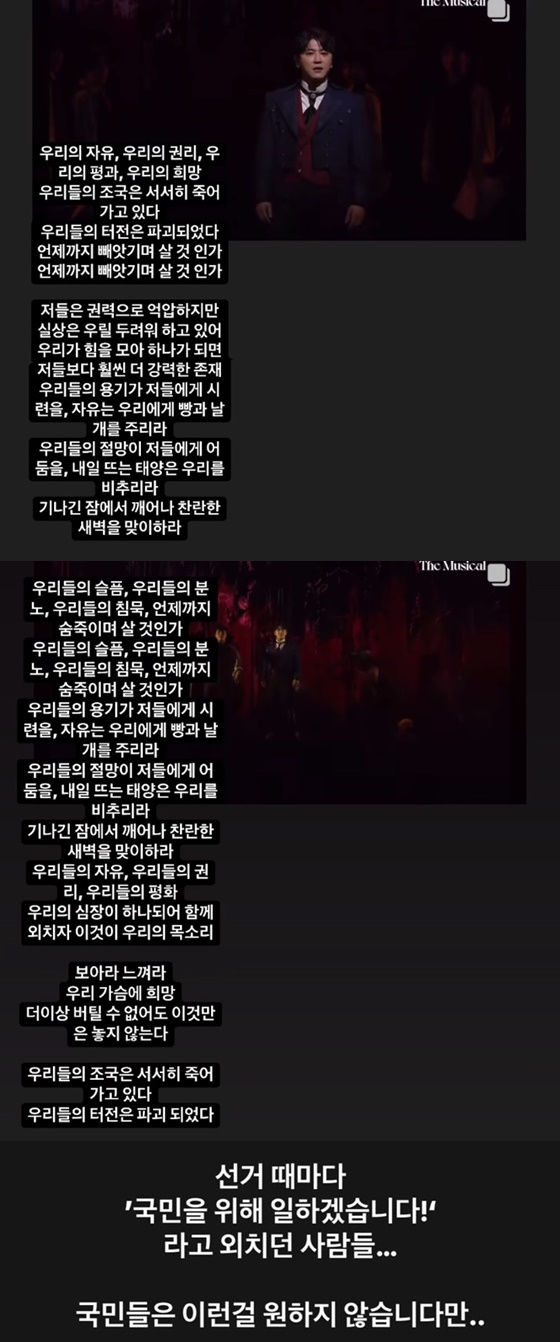 여기엔 본인이 참여한 뮤지컬 '베르사유의 장미' 중 한 넘버, '비밀결사'의 가사가 담겼다.