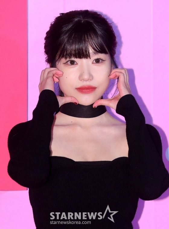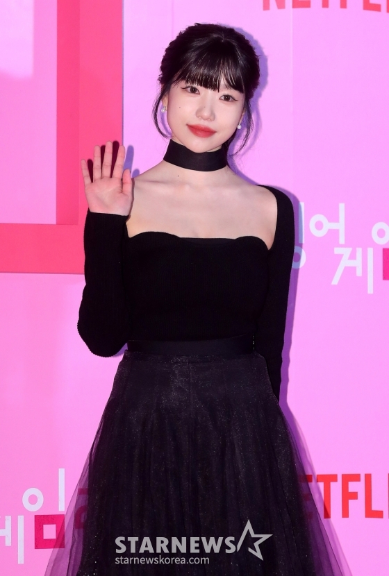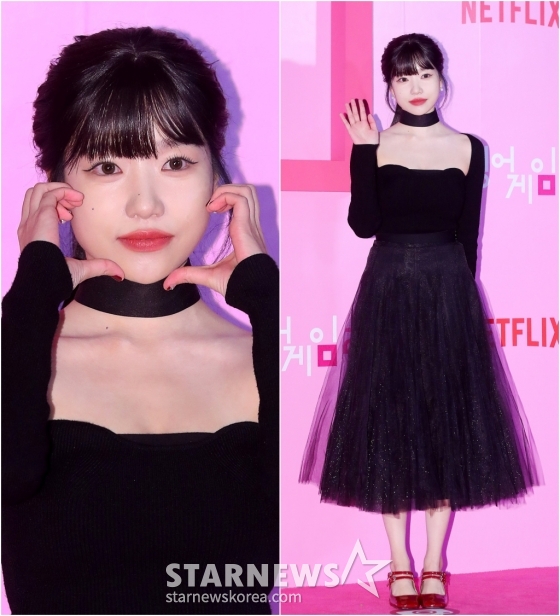 배우 조유리가 9일 오후 서울 중구 동대문디자인플라자에서 진행된 넷플릭스 시리즈 '오징어 게임 시즌2' 핑크카펫에 참석해 포즈를 취하고 있다.