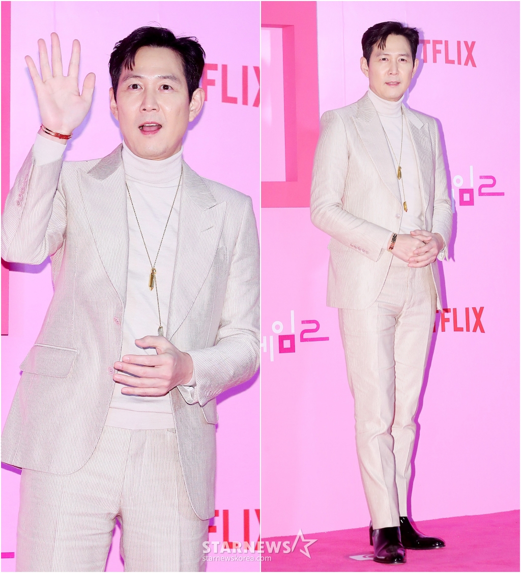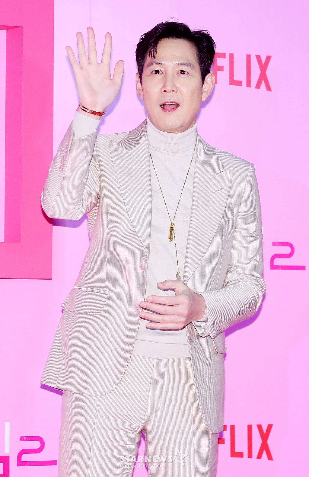 배우 이정재가 9일 오후 서울 중구 동대문디자인플라자에서 진행된 넷플릭스 시리즈 '오징어 게임 시즌2' 핑크카펫에 참석해 포즈를 취하고 있다.