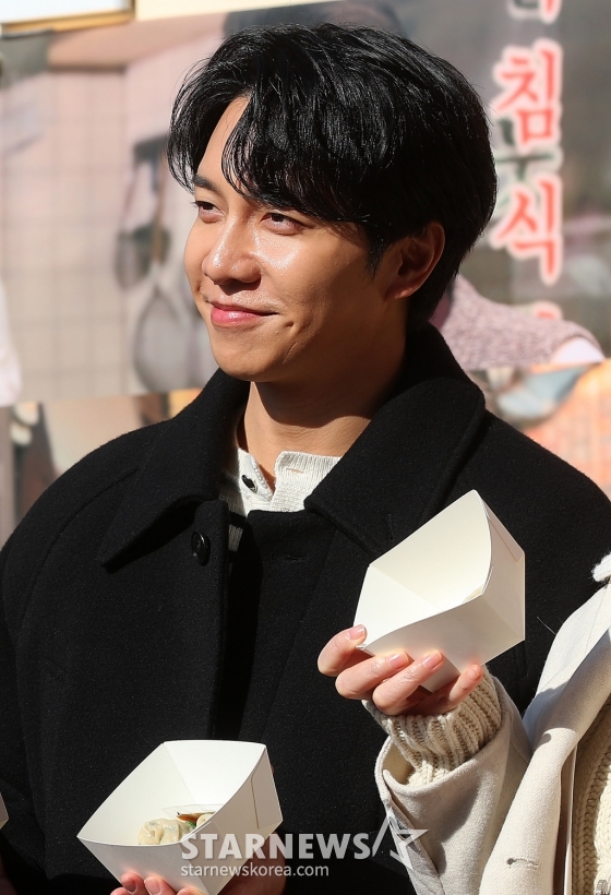 배우 이승기가 10일 오후 서울 중구 한국프레스센터 앞 광장에서 진행된 영화 '대가족' 만두트럭 이벤트 행사에 참석해 미소를 짓고 있다.