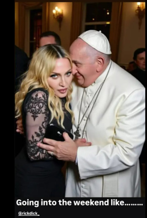 세계적인 팝스타 마돈나(66)가 또다시 '종교 모독' 논란에 휩싸였다. 이번엔 프란치스코 교황(87)과 짙은 스킨십을 나누는 AI(인공지능) 생성 사진을 공유, 비난을 얻고 있다.