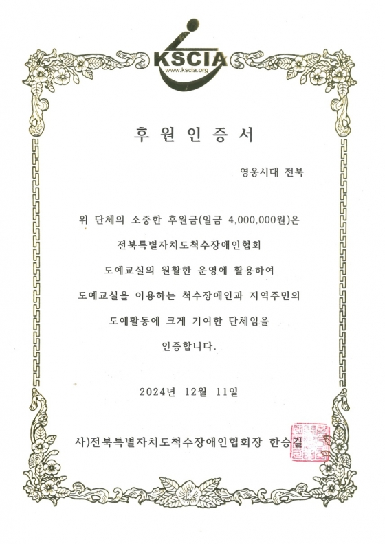 '영웅시대 전북'은 2022년부터 전북특별자치도척수장애인협회를 세 번째 후원하며 인연을 이어오고 있다.