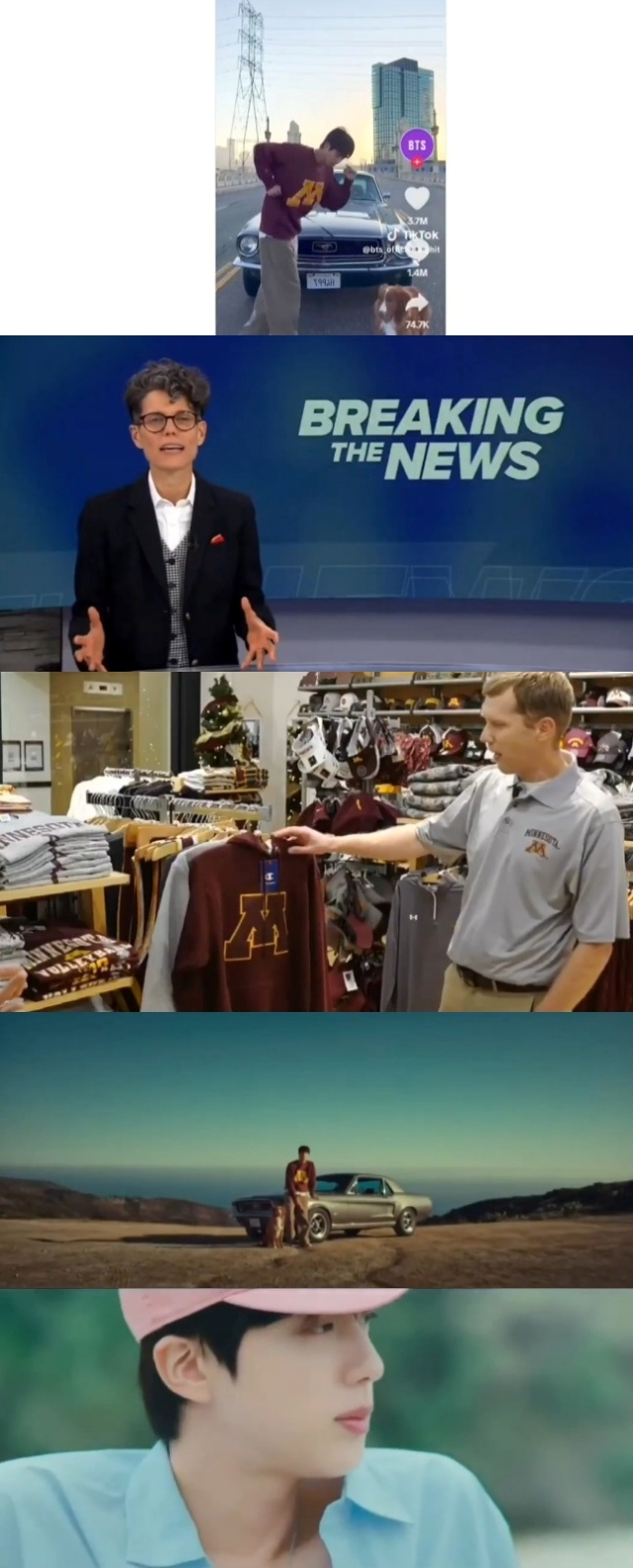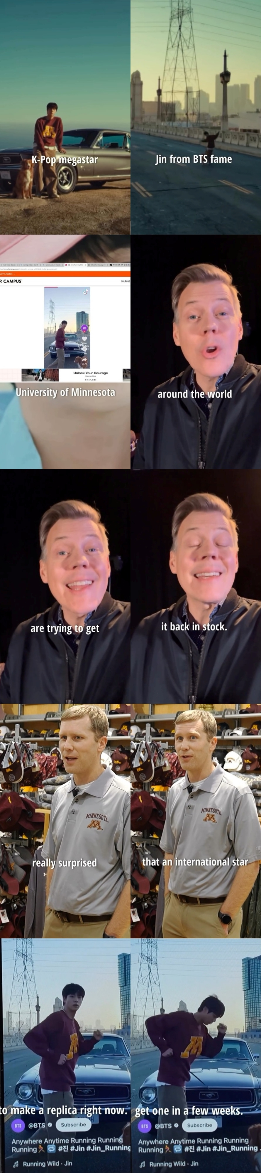 KARE 방송국은 또 다른 뉴스를 통해 K팝 대스타 BTS 진이 그의 최신 뮤직비디오에서 미네소타 대학 빈티지 스웨트셔츠를 입은 모습이 포착됐다며 덕분에 전 세계의 K팝 팬들이 진의 착장템을 확보하고자 애쓰고 있는 가운데, 미네소타 대학교 산하 북스토어측은 "해당 스웨트셔츠는 2000년대 초반 제품으로 보입니다" "국제적인 대스타가 미네소타 대학 빈티지 스웨트셔츠를 입고 나올 줄은 정말 예상치 못했습니다"라고 말하며 해당 제품의 재입고를 위해 노력하는 중이라고 설명했다.