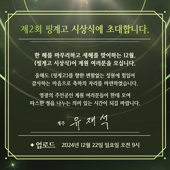 제작진에 따르면 '계주' 유재석은 "한 해를 마무리하고 새해를 맞이하는 12월, '핑계고 시상식'이 계원 여러분을 모신다. 올해도 '핑계고'를 향한 변함없는 성원에 힘입어 감사하는 마음으로 축하의 자리를 마련했다. 영광의 주인공인 계원 여러분이 한데 모여 따스한 정을 나누는 의미 있는 시간이 되길 바란다"라고 전했다.