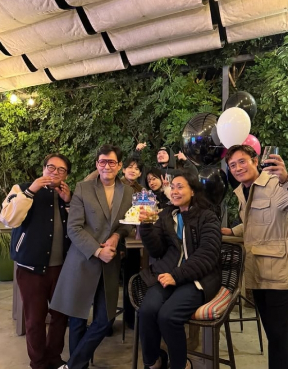 공개된 사진 속엔 이정재는 넷플릭스 오리지널 시리즈 '오징어 게임2' 출연진인 이병헌을 포함해 임시완, 조유리 등이 함께 카메라를 응시한다. 그들은 이정재의 생일을 축하해주기 위해 모였으며, 밝은 웃음을 짓고 있다.