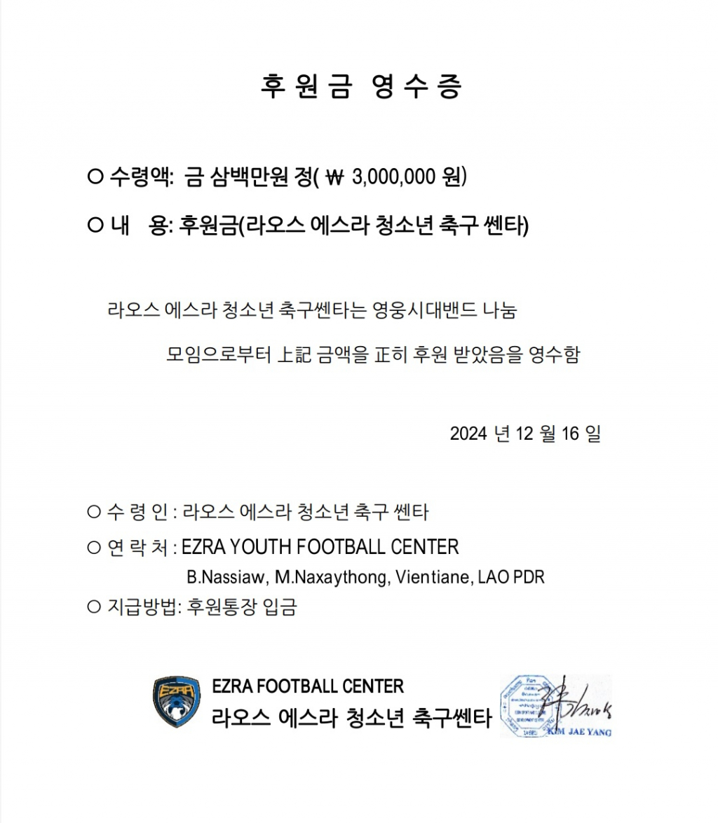 영웅시대밴드(나눔모임)은 "특별히 2024년 연말을 맞아 라오스의 열악한 여건과 시설에서 축구를 통하여 자신의 미래를 꿈꾸어 가는 라오스 유·청소년들에게 힘이 되어 주고자 하는 마음에서 후원금을 전달한다"며 "후원금이 꼭 필요한 곳에 유익히게 사용되기를 부탁드린다"고 전했다.
