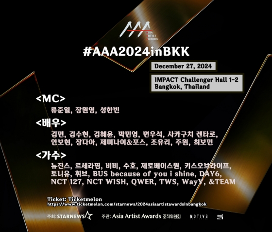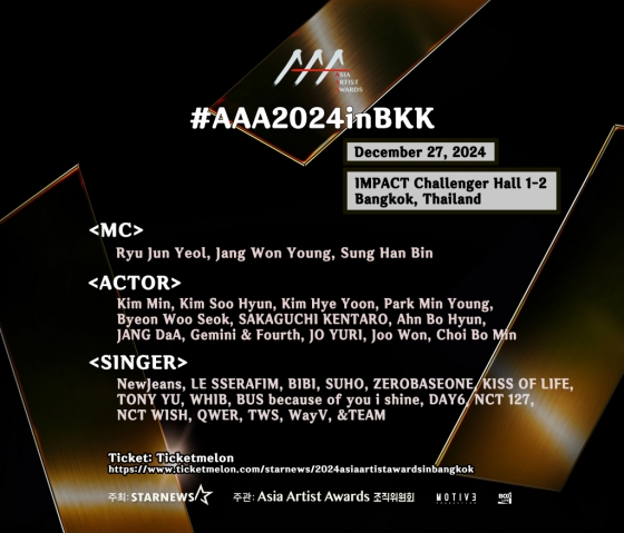 배우와 가수를 통합해 시상하는 국내 최초의 통합 시상식 'AAA 2024'는 스타뉴스가 주최하고 AAA 조직위원회, 모티브 프로덕션(MOTIVE PRODUCTION), 박스 라이브(BOX LIVE)가 주관한다. 류준열과 장원영, 성한빈이 MC를 맡았다.