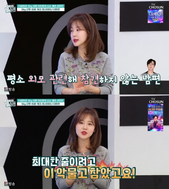 이하정은 올해 6kg 감량에 성공했다며 49.9kg 체중 인증샷까지 공개해 눈길을 끌었다. 그는 다이어트 비법에 대해 "독한 마음을 먹고 시작했다. 한 번도 외모 이야기를 하지 않던 남편이 어느 날 '얼굴에 살이 좀 붙은 것 같다'고 하더라. 그날부터 다이어트를 시작했다"면서 "탄수화물을 최대한 줄이려고 이 악물고 참았다"고 밝혔다.
