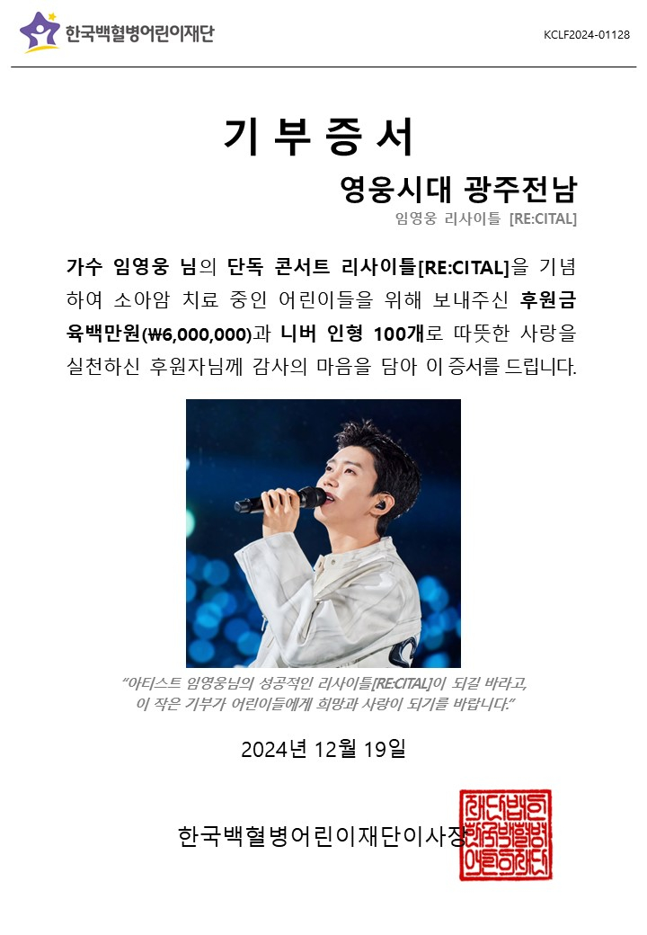 임영웅 팬클럽 '영웅시대 광주전남'은 12월 19일자로 소아암 전문 비영리단체 한국백혈병어린이재단(이사장 신희영)에 600만 원을 기부했다.