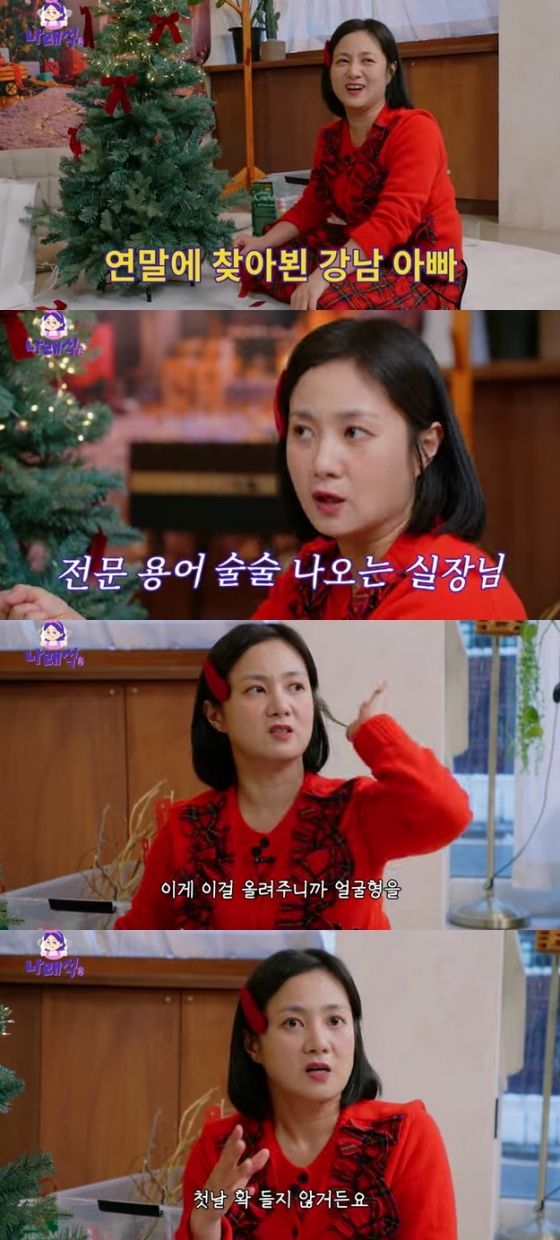 공개된 영상 속 박나래는 트리 꾸미기에 나섰고, 제작진은 "언니 볼에 멍이 들었는데 뭐 맞았냐"라고 물었다. 그는 "강남 아빠한테 맞았다. 다 합법적으로 누워서 맞았다"고 밝혔다.