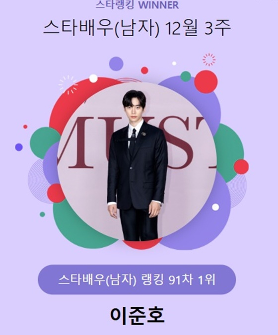 이준호는 지난 12일 오후 3시 1분부터 19일 오후 3시까지 진행된 12월 3주(91차) 스타랭킹 스타배우 남자 랭킹 투표에서 1위를 차지했다.