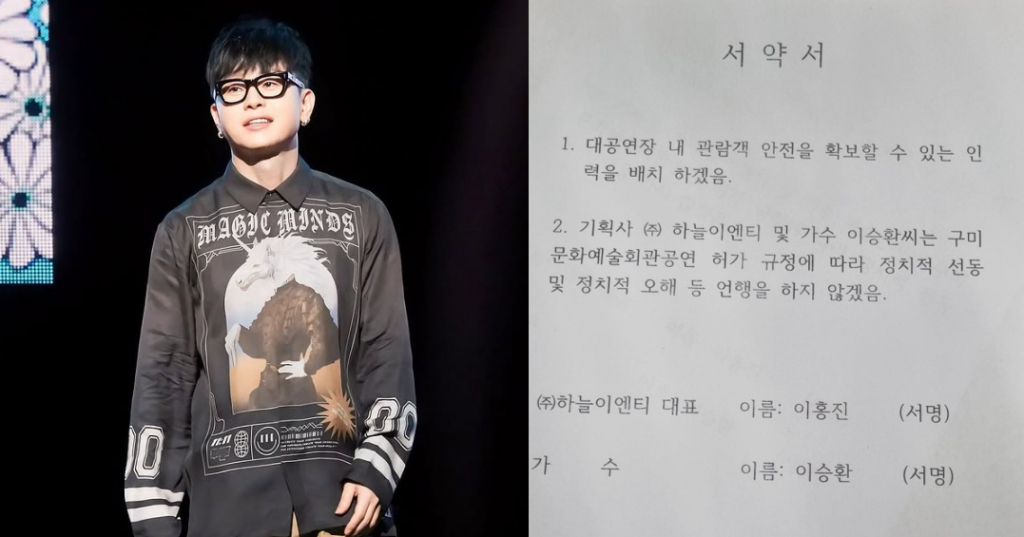 서약서에는 '1. 대공연장 내 관람객 안전을 확보할 수 있는 인력을 배치하겠음. 2. 기획사 및 가수 이승환 씨는 구미 문화예술회관공연 허가 규정에 따라 정치적 선동 및 정치적 오해 등 언행을 하지 않겠음'이라고 적혀있다.