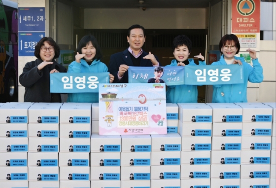 임영웅 팬클럽 포항·대구 영웅시대 영웅바라기는 12월 19일 대구 남구청에 저소득 독거 어르신 세대에 300만 원 상당 떡국세트를 기부했다.