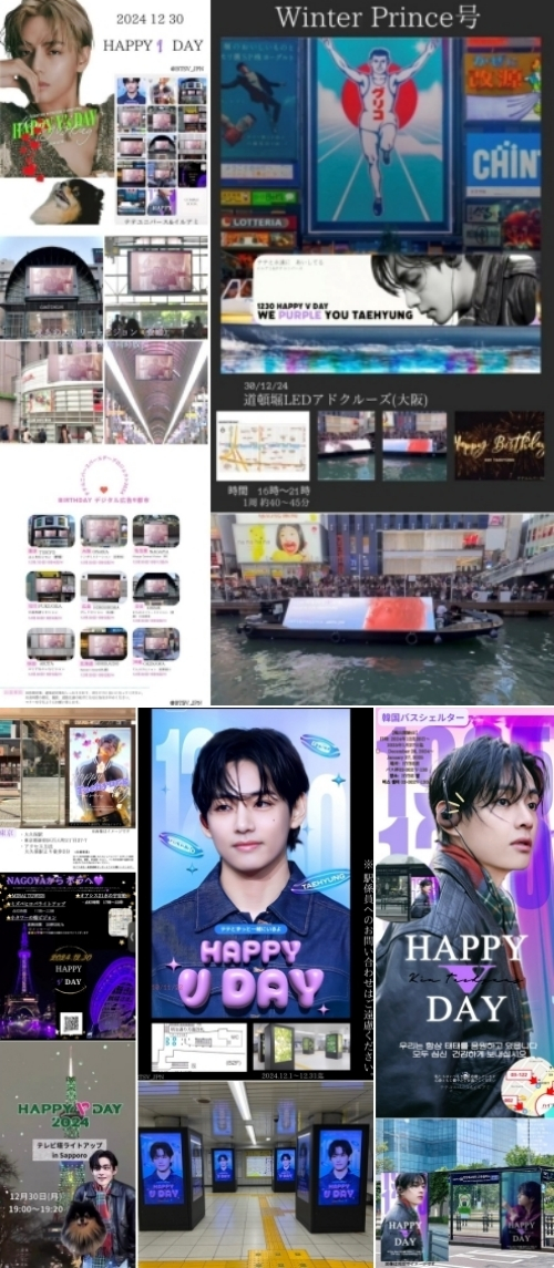 일본 전역의 대형 광고판에도 뷔의 생일을 축하하는 영상이 송출돼 일본 현지인들의 이목을 집중시키고 있다. 일본 대도시 및 유명관광지인 도쿄, 오사카, 나고야, 후쿠오카, 히로시마, 에히메, 아키타, 삿포르, 오키나와 등 9개 도시의 중심부에 위치한 대형광고판에도 뷔를 사랑하는 일본팬들의 마음이 전달될 예정이다.