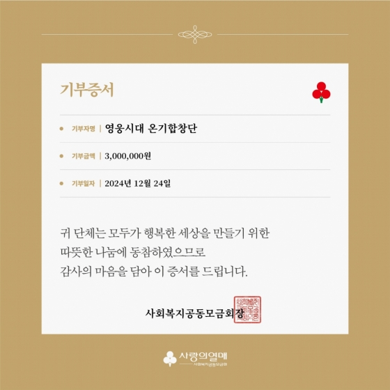 임영웅 팬클럽 '영웅시대 온기합창단'은 12월 24일 사랑의열애 사회복지공동모금회에 300만 원을 기부했다.