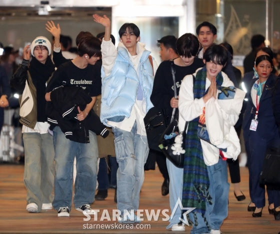 그룹 투어스(TWS, 신유, 도훈, 영재, 한진, 지훈, 경민)가 태국 방콕에서 열리는 '제 9회 아시아 아티스트 어워즈'(The 9th Asia Artist Awards, 이하 'AAA 2024')' 참석을 위해 26일 오후 수완나품 공항을 통해 입국하고 있다.