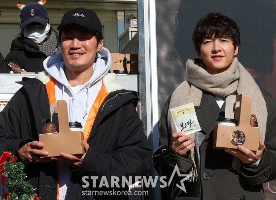 배우 이희준, 송중기가 24일 오후 서울 중구 한국프레스센터 앞 광장에서 진행된 영화 '보고타: 마지막 기회의 땅' 간식차 이벤트 행사에 참석해 포즈를 취하고 있다. '보고타'는 IMF 직후, 새로운 희망을 품고 지구 반대편 콜롬비아 보고타로 향한 국희(송중기)가 보고타 한인 사회의 실세 수영(이희준), 박병장(권해효)과 얽히게 되면서 벌어지는 이야기다. 오는 31일 개봉. 2024.12.24 /사진=김창현 chmt@