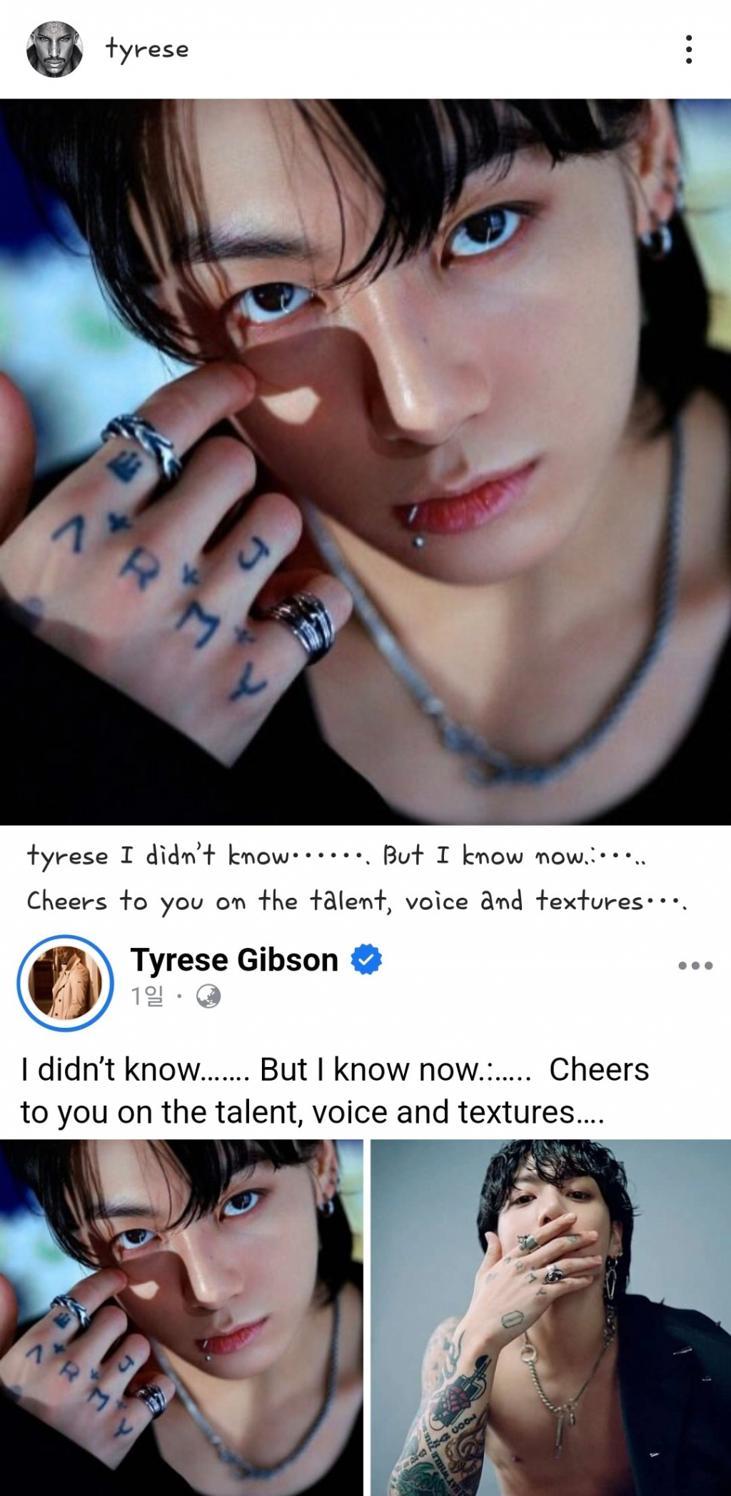 '분노의 질주', '트랜스포머' 시리즈에 출연한 할리우드 유명 배우이자 가수 타이리스 깁슨(Tyrese Gibson)은 최근 자신의 인스타그램 계정을 통해 정국의 사진 2장을 게재했다.