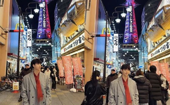 공개된 사진 속에는 일본 여행 중인 진화의 모습이 담겼다. 그는 빨간 목도리에 체크 코트를 입고 훈훈한 비주얼을 자랑했다.