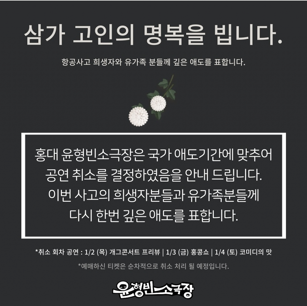 윤형빈소극장 측은 공식 SNS를 통해 "항공사고 희생자와 유가족 분들에게 깊은 애도를 표한다. 삼가 고인의 명복을 빕니다"라며 "국가 애도기간에 맞춰 공연 취소를 결정했음을 안내드린다"라고 밝혔다.