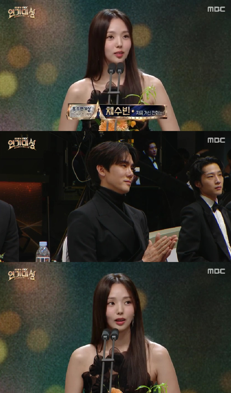 이날 우수연기상 미니시리즈 부문 여자 수상자는 '지금 거신 전화는'의 채수빈이 차지했다. 채수빈은 "이런 자리에 오기 전에 가슴 아픈 소식을 들어서 진심으로 마음이 아프고, 마음 깊이 애도를 표한다"고 운을 뗐다.