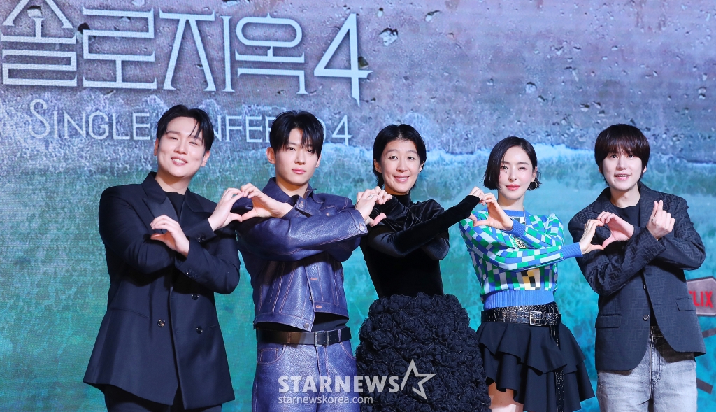 가수 한해, 방송인, 덱스, 홍진경, 배우 이다희, 가수 규현이 8일 오전 서울 마포구 호텔 나루 엠갤러리에서 진행된 넷플릭스 시리즈 '솔로지옥4' 제작발표회에 참석해 포즈를 취하고 있다.
