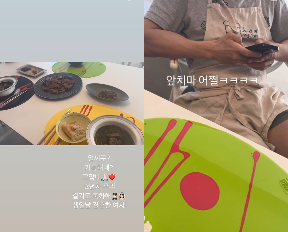 이어 앞치마를 매고 앉아있는 엄태웅의 모습을 공개하며 "앞치마 어쩔"이라고 덧붙이며 단란한 부부의 모습을 자랑했다.