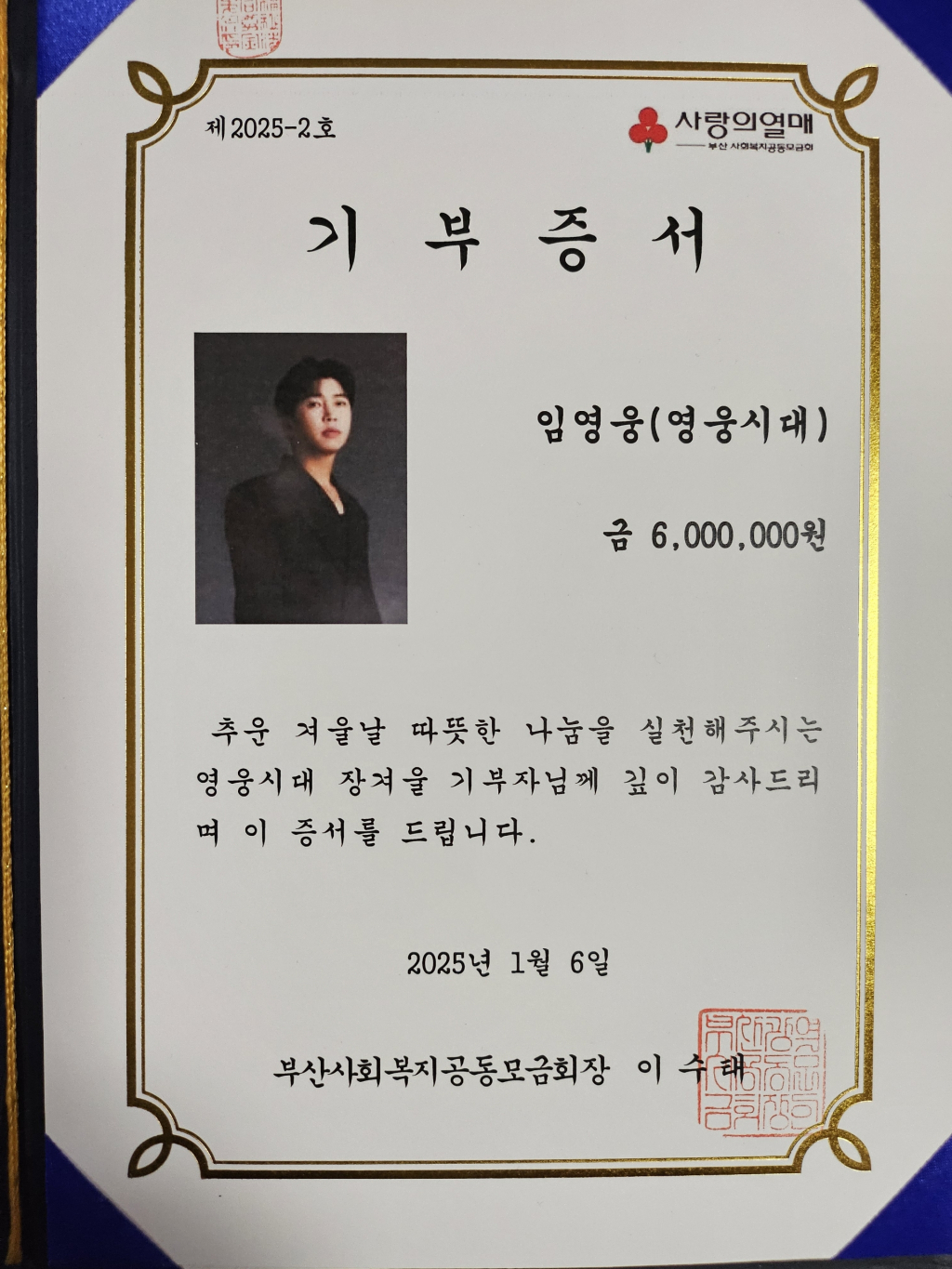 임영웅 팬클럽 영웅시대 '장겨울' 회원은 1월 6일 부산 북구청(구청장 오태원)을 찾아 임영웅 이름으로 사랑의열매 부산사회복지공동모금회에 이웃 돕기 성금 600만 원을 기탁, 희망 2025 나눔 캠페인에 동참했다. 기탁한 성금은 관내 독거노인 및 취약 계층 아동들에게 지원될 예정이다.
