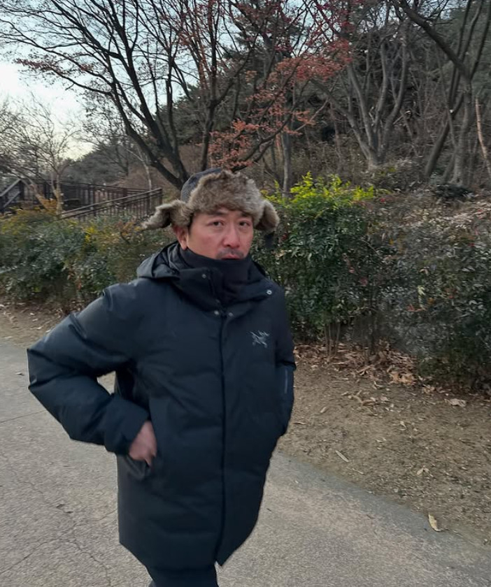 공개된 사진 속엔 산 속을 산책하는 하정우의 모습이 담겨있다. 그는 군밤 모자와 패딩을 차려입고 힘겹게 걸어가고 있다.