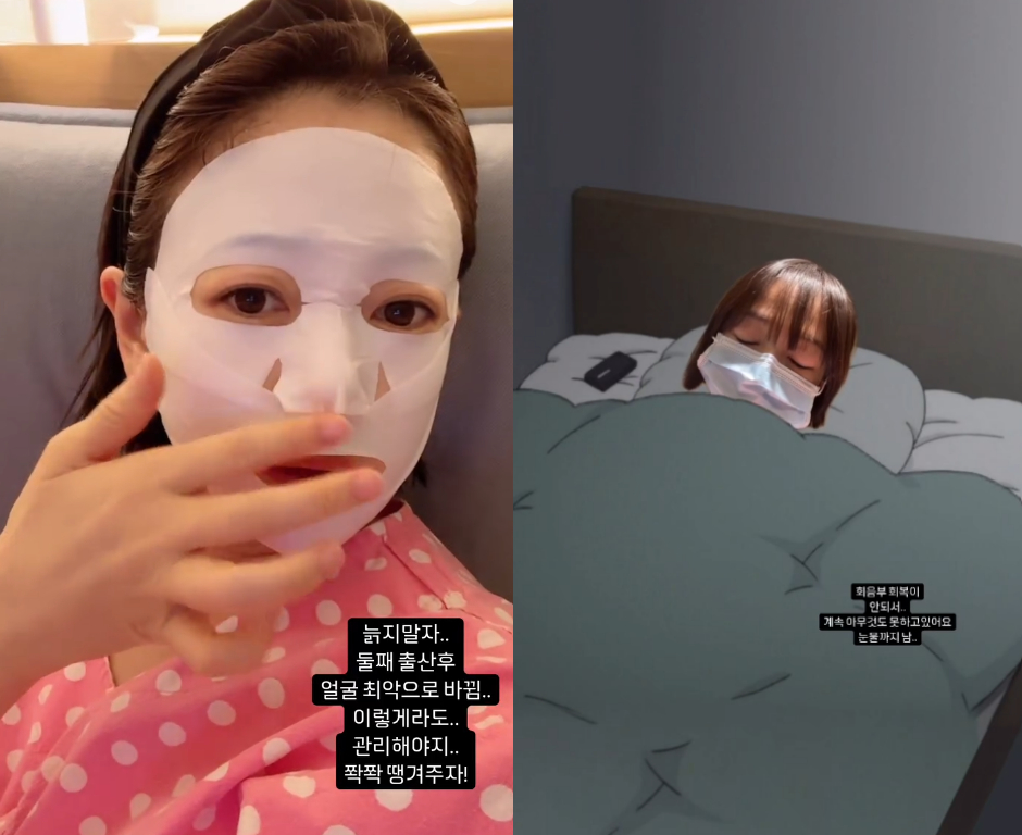 공개된 영상 속에는 출산 후 회복하는 과정에서 마스크팩을 하고 있는 김보미의 모습이 담겼다.