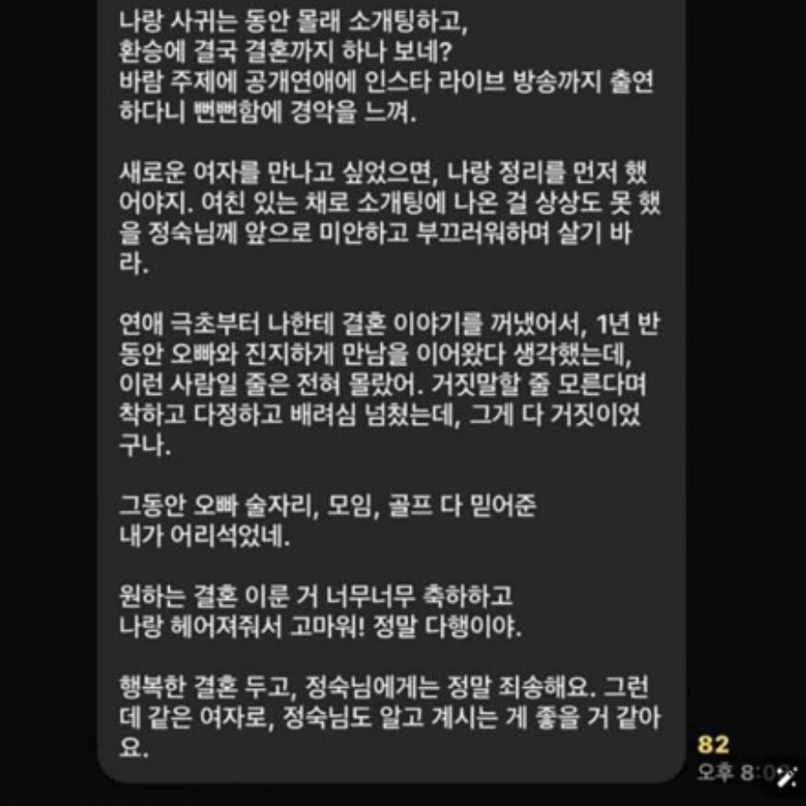 작성자는 "바람 주제에 공개연애에 인스타 라이브 방송까지 출연하다니 뻔뻔하다. 새로운 여자를 만나고 싶었으면 나와의 관계를 먼저 정리했어야지. 여친 있는 채로 소개팅에 나온 걸 상상도 못했을 정숙님께 미안하고 부끄러워하며 살기 바란다"라며 "연애 극초부터 나한테 결혼 이야기를 꺼냈어서 1년 반동안 오빠와 진지하게 만남을 이어왔다 생각했는데 이런 사람일 줄 몰랐어. 거짓말 할줄 모른다며 착하고 다정하고 배려심 넘쳤는데 그게 다 거짓이었구나"라고도 강조했다.
