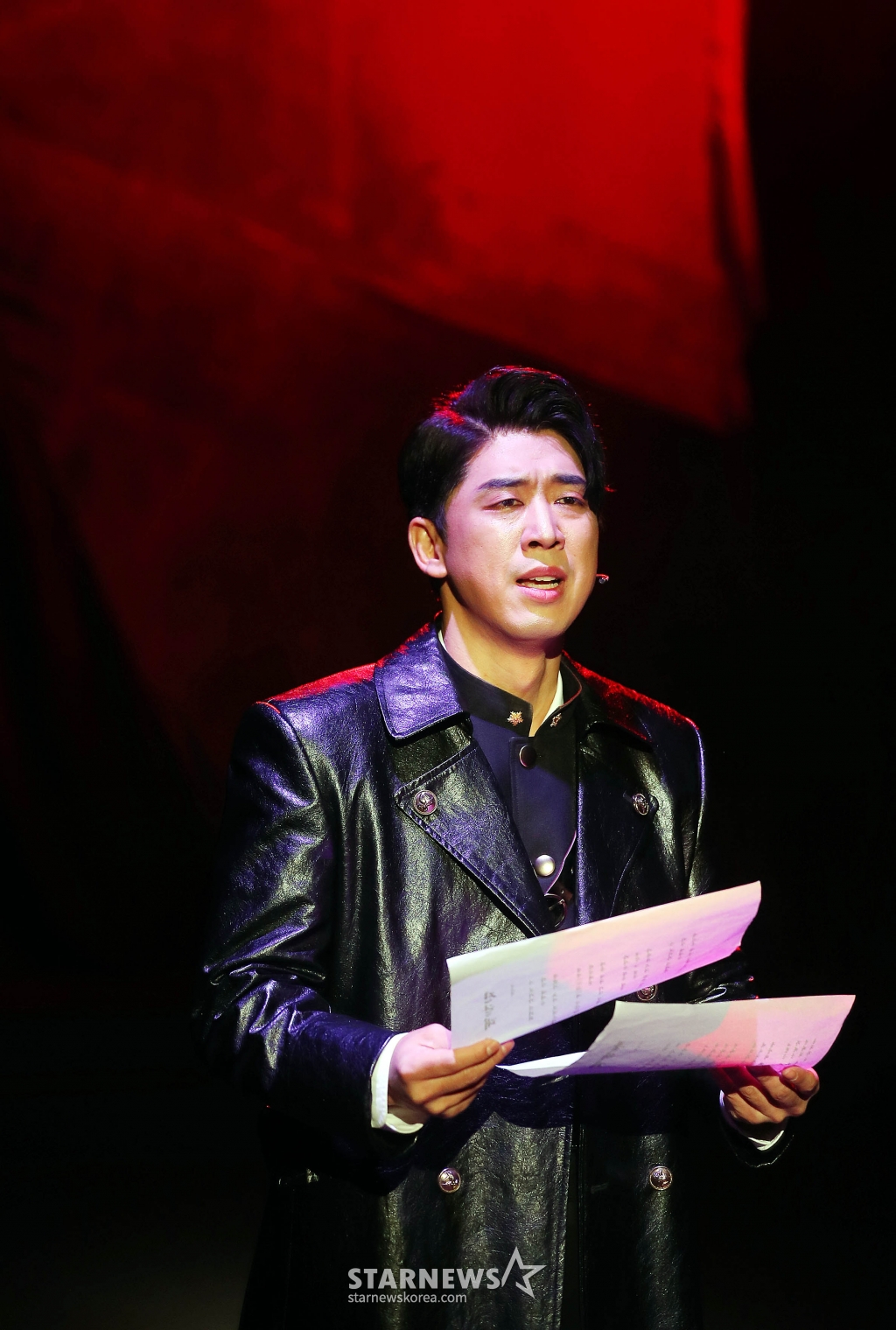 배우 김진철이 16일 오후 서울 마포구 서강대학교 메리홀에서 진행된 뮤지컬 '어제의 시는 내일의 노래가 될 수 있을까' 프레스콜에서 열연하고 있다.