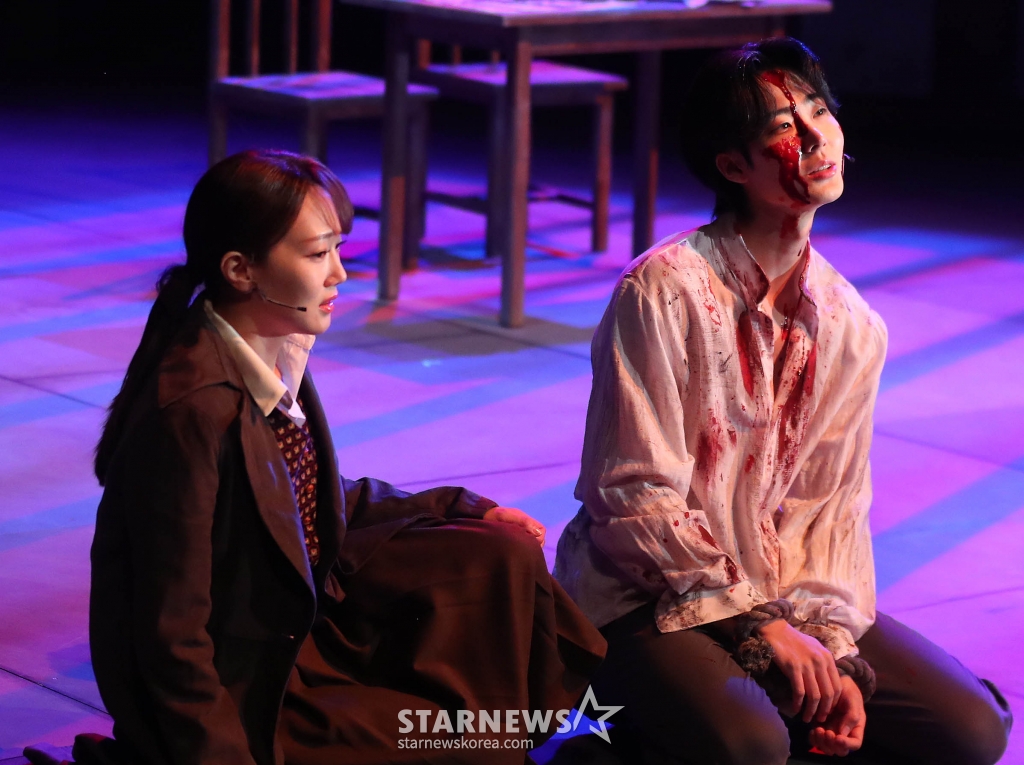 배우 한수림, 황시우가 16일 오후 서울 마포구 서강대학교 메리홀에서 진행된 뮤지컬 '어제의 시는 내일의 노래가 될 수 있을까' 프레스콜에서 열연하고 있다.