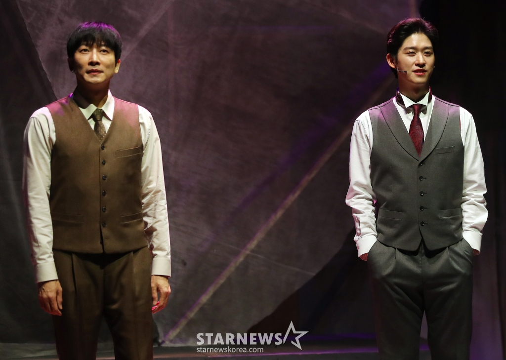 뮤지컬 배우 성태준, 김우혁이 16일 오후 서울 마포구 서강대학교 메리홀에서 진행된 뮤지컬 '어제의 시는 내일의 노래가 될 수 있을까' 프레스콜에서 열연하고 있다.