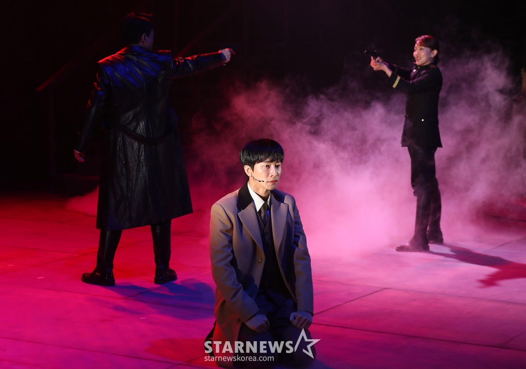 뮤지컬 배우 김진철, 성태준, 한수림이 16일 오후 서울 마포구 서강대학교 메리홀에서 진행된 뮤지컬 '어제의 시는 내일의 노래가 될 수 있을까' 프레스콜에서 열연하고 있다.