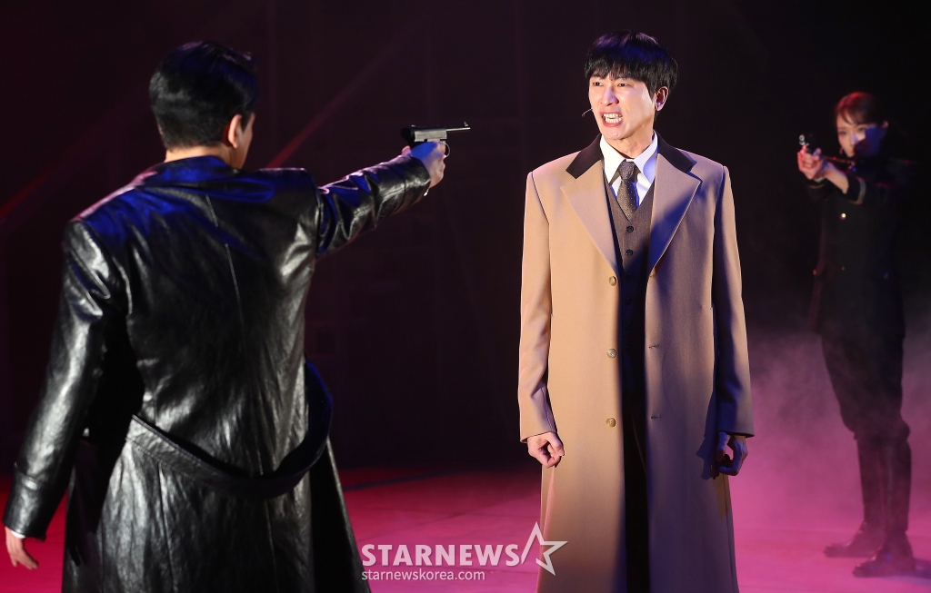 뮤지컬 배우 김진철, 성태준, 한수림이 16일 오후 서울 마포구 서강대학교 메리홀에서 진행된 뮤지컬 '어제의 시는 내일의 노래가 될 수 있을까' 프레스콜에서 열연하고 있다.