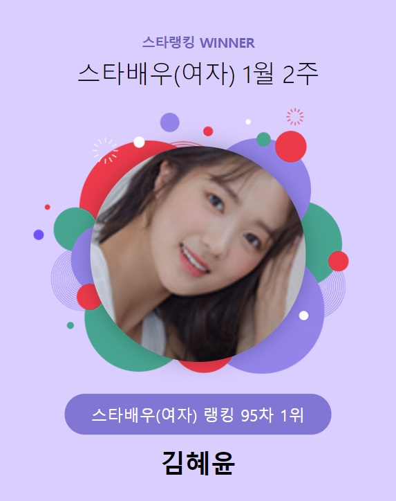 김혜윤은 지난 9일 3시 1분부터 16일 오후 3시까지 진행된 1월 2주(95차) 스타랭킹 스타배우 여자 랭킹 투표에서 2만 1130표를 얻으며 1위에 올랐다.