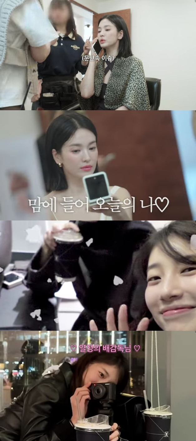 특히 수지는 송혜교와 영상과 사진을 열정적으로 찍었고, 지난 10일 공개된 유튜브 영상 '나 말고 송혜교 브이로그'의 썸네일과 송혜교의 깜짝 음원 '후애'의 커버 사진이라는 비하인드가 전해졌다.