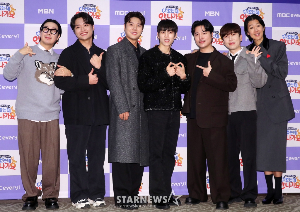 방송인 하하, 뮤지컬 배우 황성재, 배우 신정윤, 인피티느 동우, 래퍼 지조, 방송인 남창희, 홍진경이 17일 오전 서울 마포구 상암동 스탠포드 호텔에서 진행된 MBC에브리원 '다 컸는데 안 나가요' 제작발표회에 참석해 포즈를 취하고 있다.