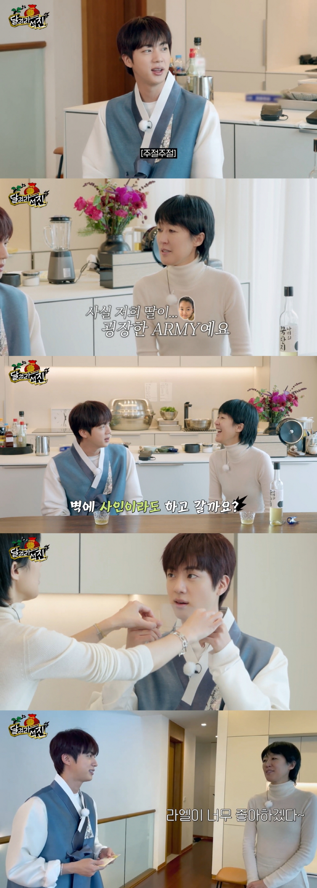 진은 지난 21일 방탄소년단 유튜브 채널에 게재된 자체 예능 '달려라 석진' 18화에서 모델 겸 방송인 홍진경과 함께 특별한 설맞이 도시락을 만들었다. 진은 홍진경이 그의 열렬한 팬으로 알려진 자신의 딸과 '혈연 커트'를 각오하고 비밀리에 촬영에 응했다고 밝히자, 그럴 리가 없다며 다급히 상황 수습에 나서 시작부터 큰 웃음을 선사했다.