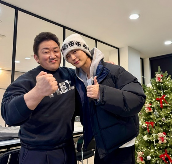 공개된 사진 속에는 마동석과 변우석이 어깨동무하고 다정한 포즈를 취하고 있다. 특히 마동석 주먹보다 작은 변우석의 얼굴 크기가 눈길을 끌었다.