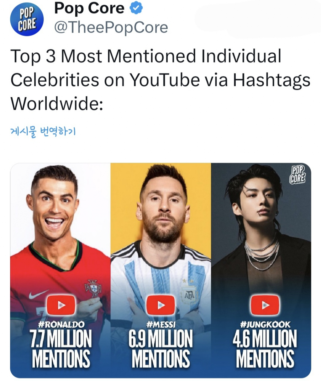 정국은 유튜브 내에서 크리스티아누 호날두(770만)와 리오넬 메시(690만)에 이어 세 번째로 많이 언급된 인물(460만)로 나타났다.